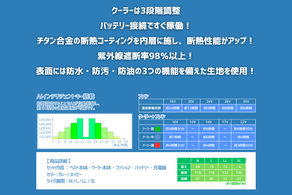 セット内容:ベスト本体・クーラー本体・ファン×2・バッテリー・充電器